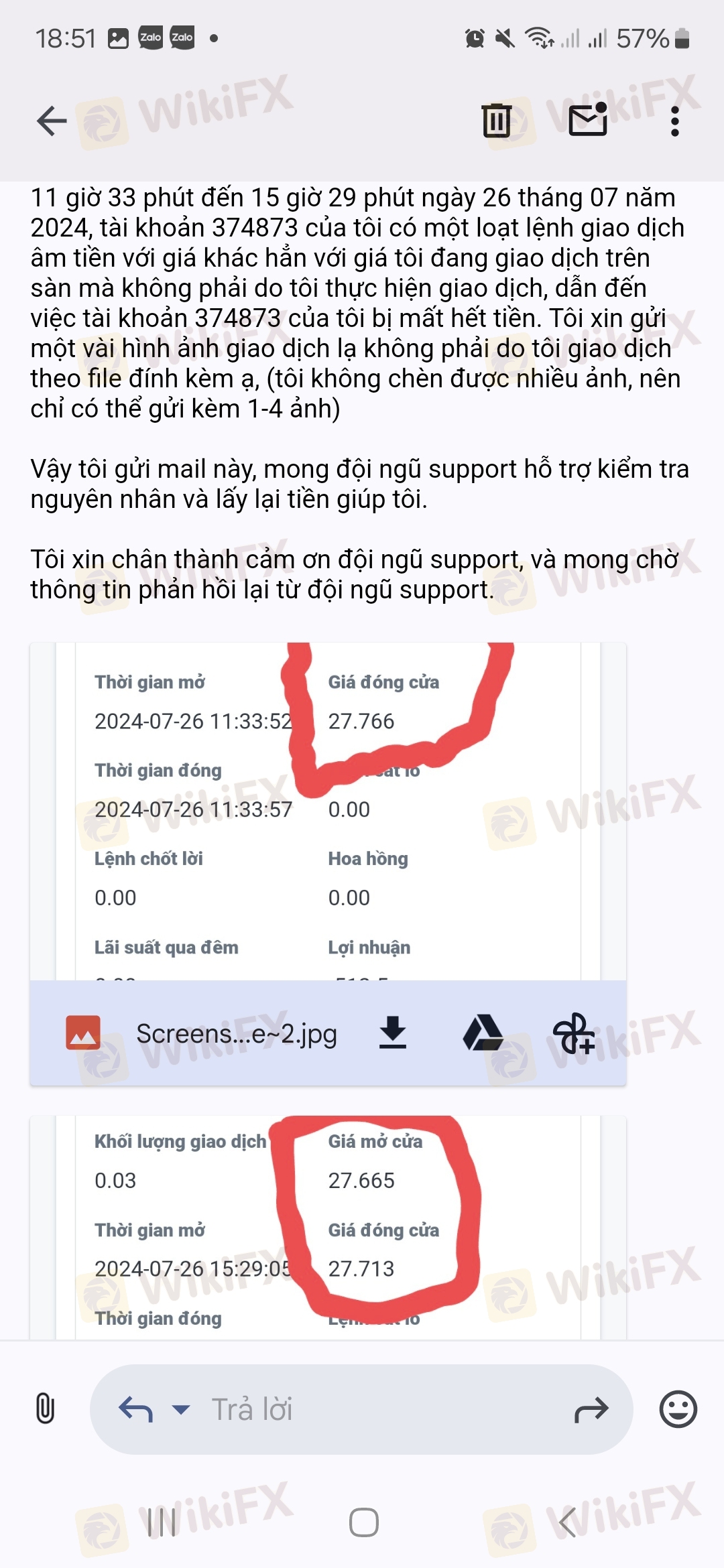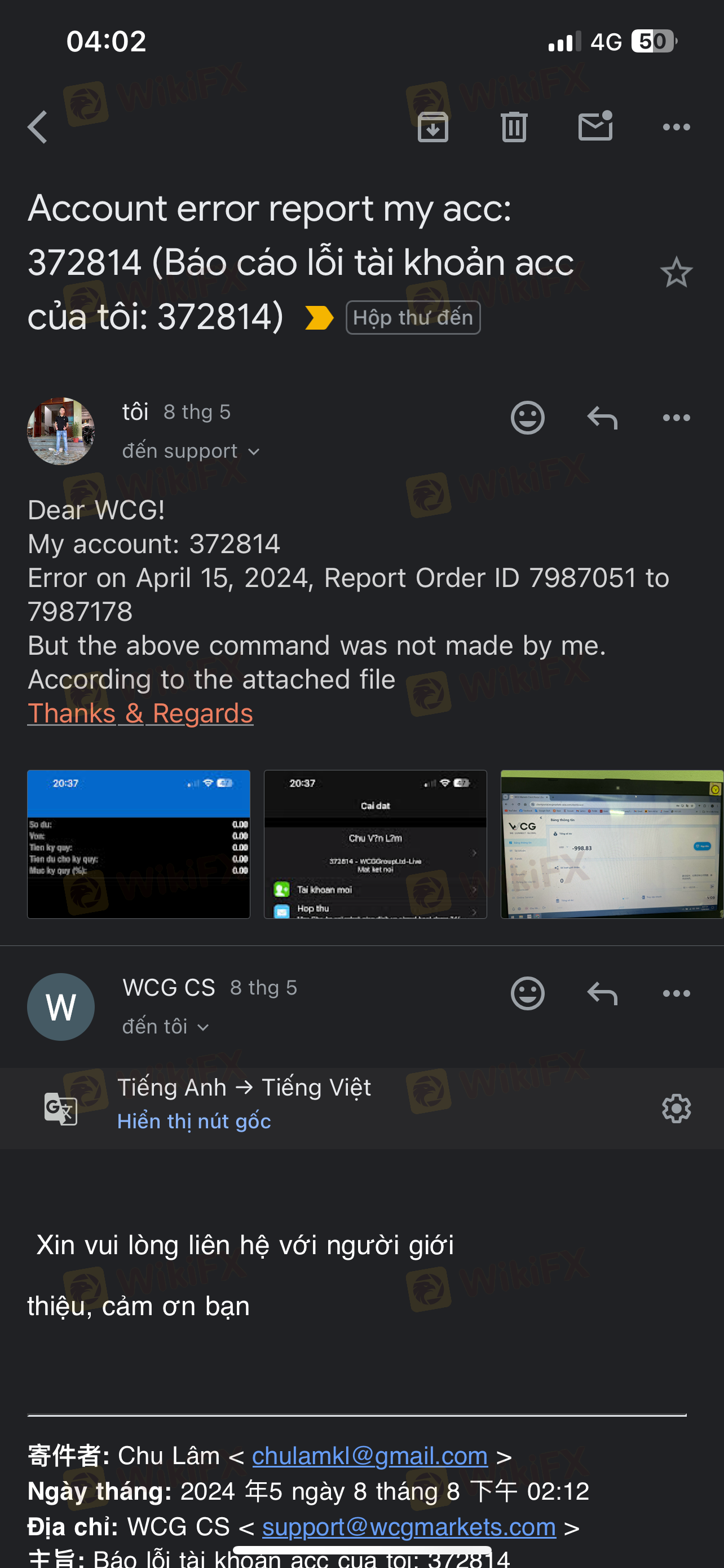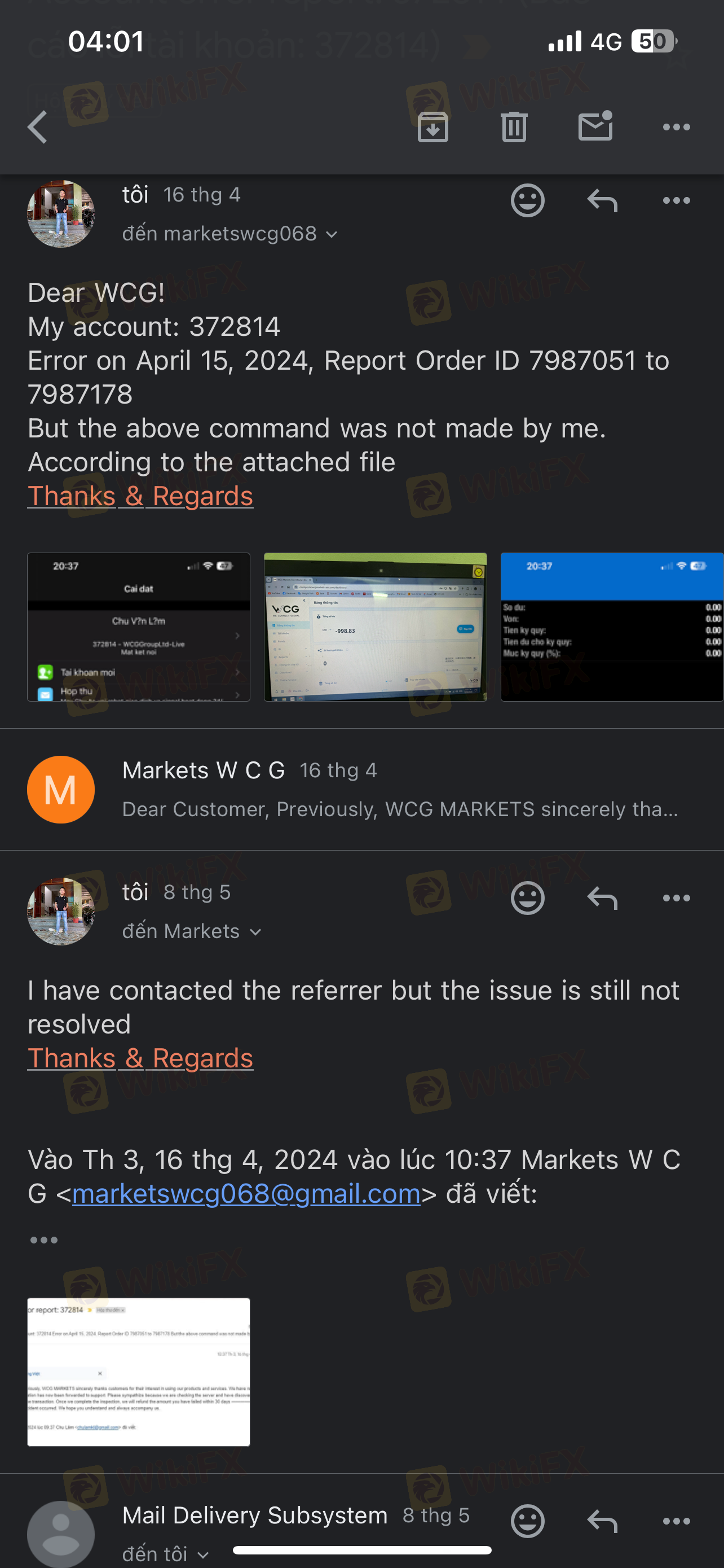 2024年7月23日,我開設了一個帳戶,在WCG市場存入了1500美元並進行交易。2024年7月26日,我又存入了700美元。在我正常交易的時候,我的帳戶突然變成負數,並且損失了所有的錢(當我檢查交易歷史時,我發現有許多交易以完全不同於市場價格的價格執行,而且這些交易並不是我發起的)。我已經聯繫了引導我在WCG市場開設帳戶的人尋求幫助,但我無法再聯繫到他們。我還向WCG支援部門發送了三封電子郵件,但對於這個問題我沒有收到任何回應。